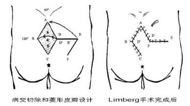 改良Limberg皮瓣转移术:菱形切除病灶后,利用邻近皮瓣无张力覆盖创面,复发率仅0-5%,适合病灶范围大的病例;