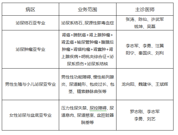 学科目前共开放床位130余张。学科年累计收治住院病人6000余人次、门诊就诊患者30000余人次。近年来学科着眼于长远发展目标,发展成集"泌尿系肿瘤、泌尿系结石、女性泌尿与盆底外科、男科与小儿泌尿外科"等四大亚专业全面均衡发展的大型现代化临床科室。