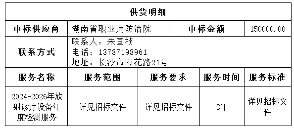 南华大学附属第二医院的南华大学附属第二医院2024-2026年放射诊疗设备年度检测服务项目于2024年11月06日结束,现将中标结果公告如下:
