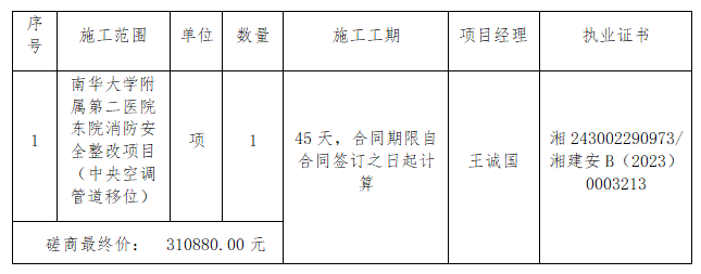 南华大学附属第二医院的东院消防安全整改项目(中央空调管道移位)于2025年2月20日结束,现将成交结果公告如下: