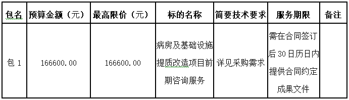 服务范围:病房及基础设施提质改造项目前期咨询服务,具体详见采购需求。