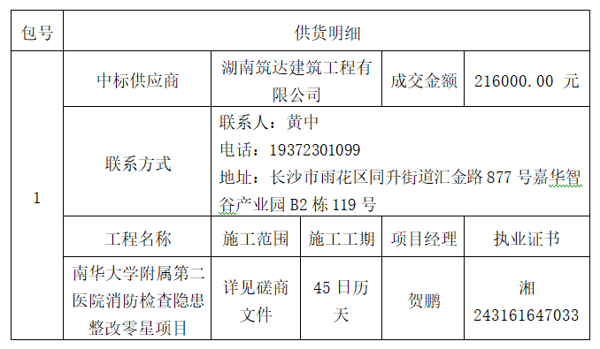 南华大学附属第二医院消防检查隐患整改零星项目于2025年11月25日结束,现将中标(成交)结果公告如下: