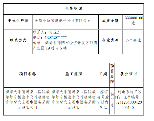 南华大学附属第二医院 的 教学综合楼宿舍及行政楼宿舍智慧安全用电设备采购及施工项目于2025年11月28日结束,现将成交结果公告如下: